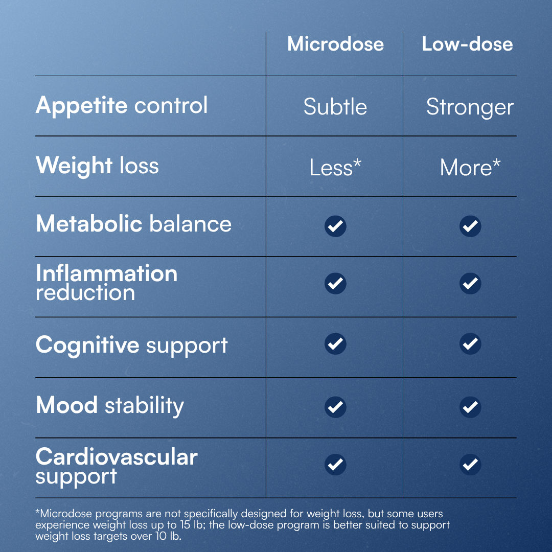 Microdose is ideal for people focused on longevity, energy, inflammation, and subtle optimization that complements existing healthy habits. Low-Dose is best for those seeking stronger appetite control, steady fat loss, and deeper metabolic improvement while maintaining balance and comfort.