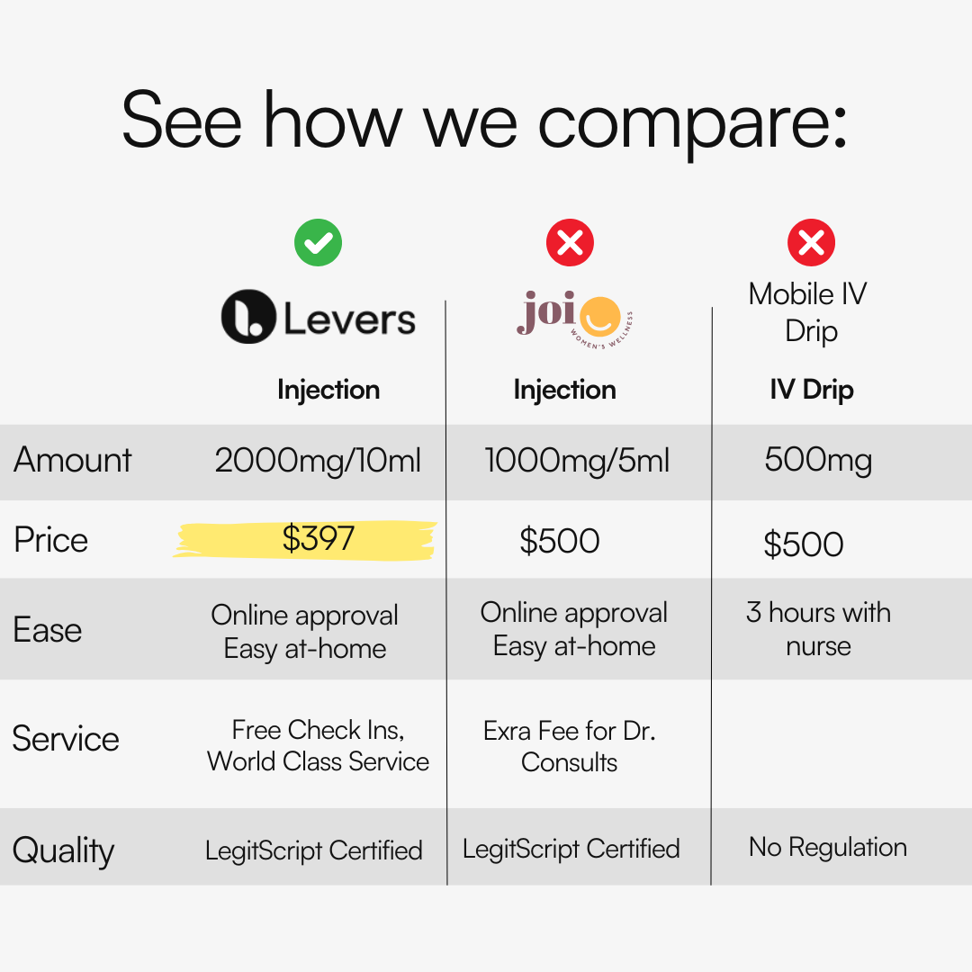 Includes 2-4x the NAD+ of other providers. Many clinics only include 250-500mg/mo of NAD+. More is better.